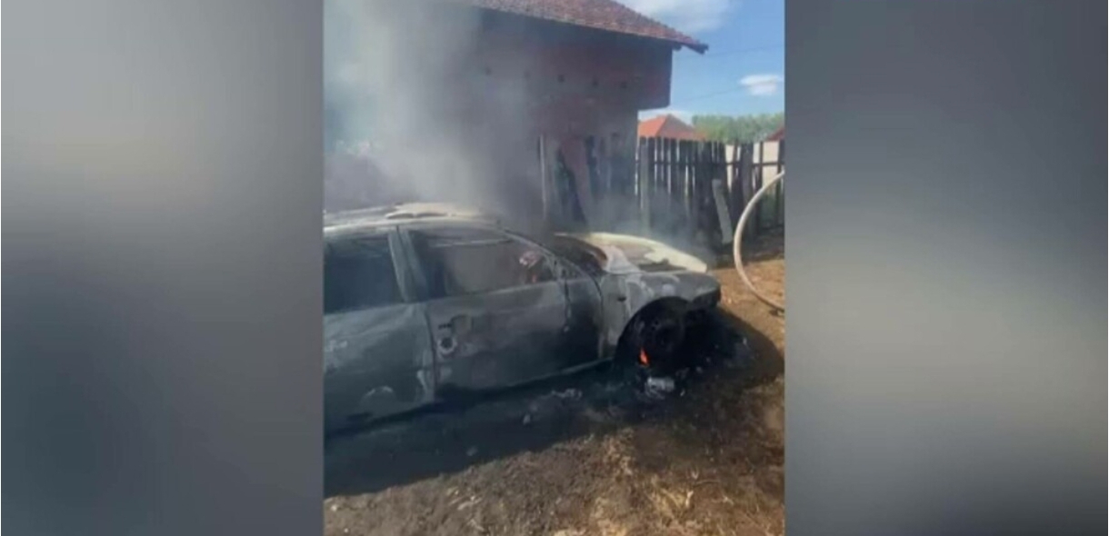 O mașină a ars complet, iar două case au fost la un pas să fie distruse de incendiu, în județul vecin