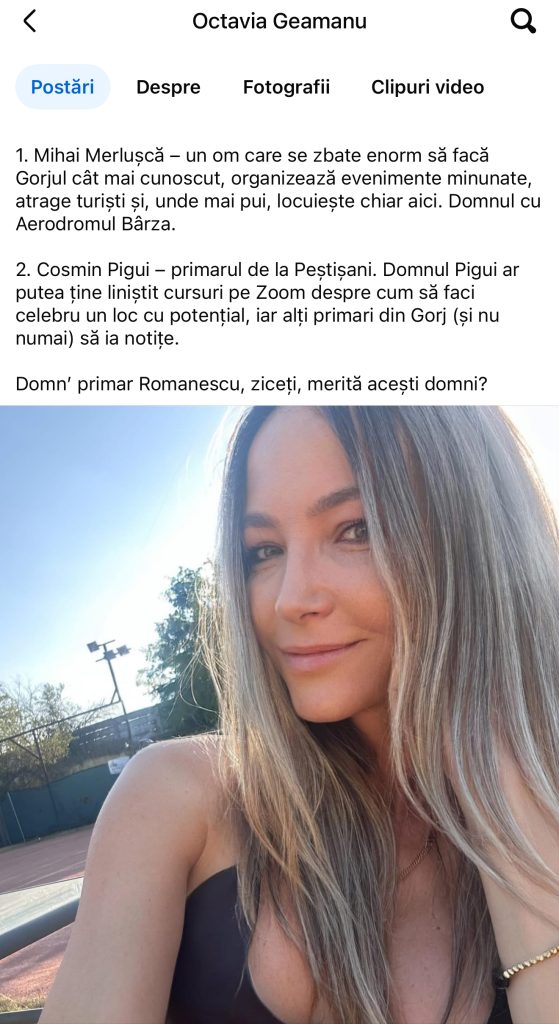 În urma evenimentului de la Zilele Municipiului Târgu Jiu, când primarul Marcel Romanescu i-a acordat titlul de „cetățean de onoare” prezentatorului Cătălin Măruță, reacțiile din mediul online nu au întârziat să apară. Printre cei care s-au arătat, subtil dar ferm, nemulțumiți de decizie se numără și jurnalista Octavia Geamănu, originară din Târgu Jiu, care a transmis un mesaj cu subînțeles pe rețelele de socializare.