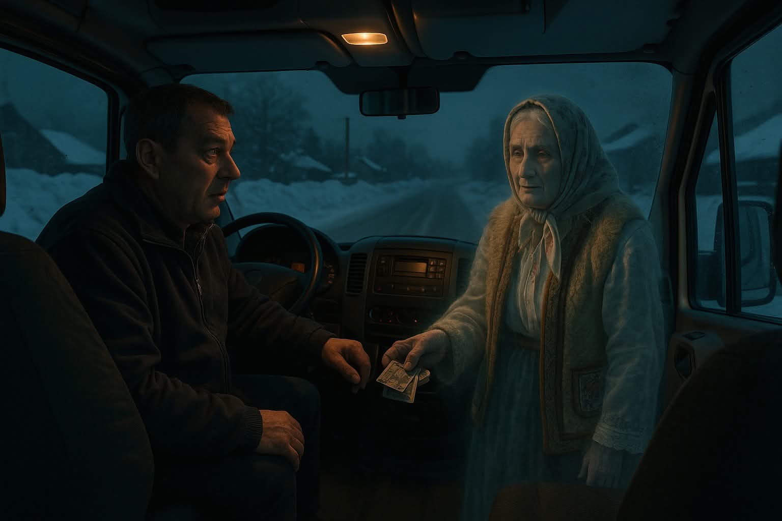La un moment dat, pe marginea drumului, a zărit o bătrânică. Stătea înfofolită într-un șal ponosit, cu un batic legat strâns sub bărbie, tremurând ușor în frig. Din milă, și pentru că oricum avea drum în acea direcție, a decis să oprească să o ia. Femeia a urcat fără să spună multe, doar i-a spus, cu o voce stinsă, locul unde dorea să fie lăsată. I-a întins un bănuț și o bancnotă veche, de pe vremea lui Ceaușescu.