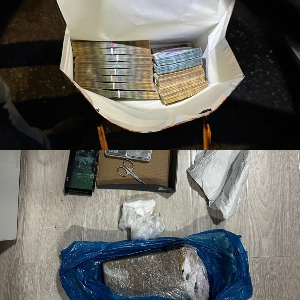 La una dintre adresele percheziționate a fost descoperită o altă cantitate, de aproximativ 1 kilogram de substanță pulverulentă, posibil cocaină.