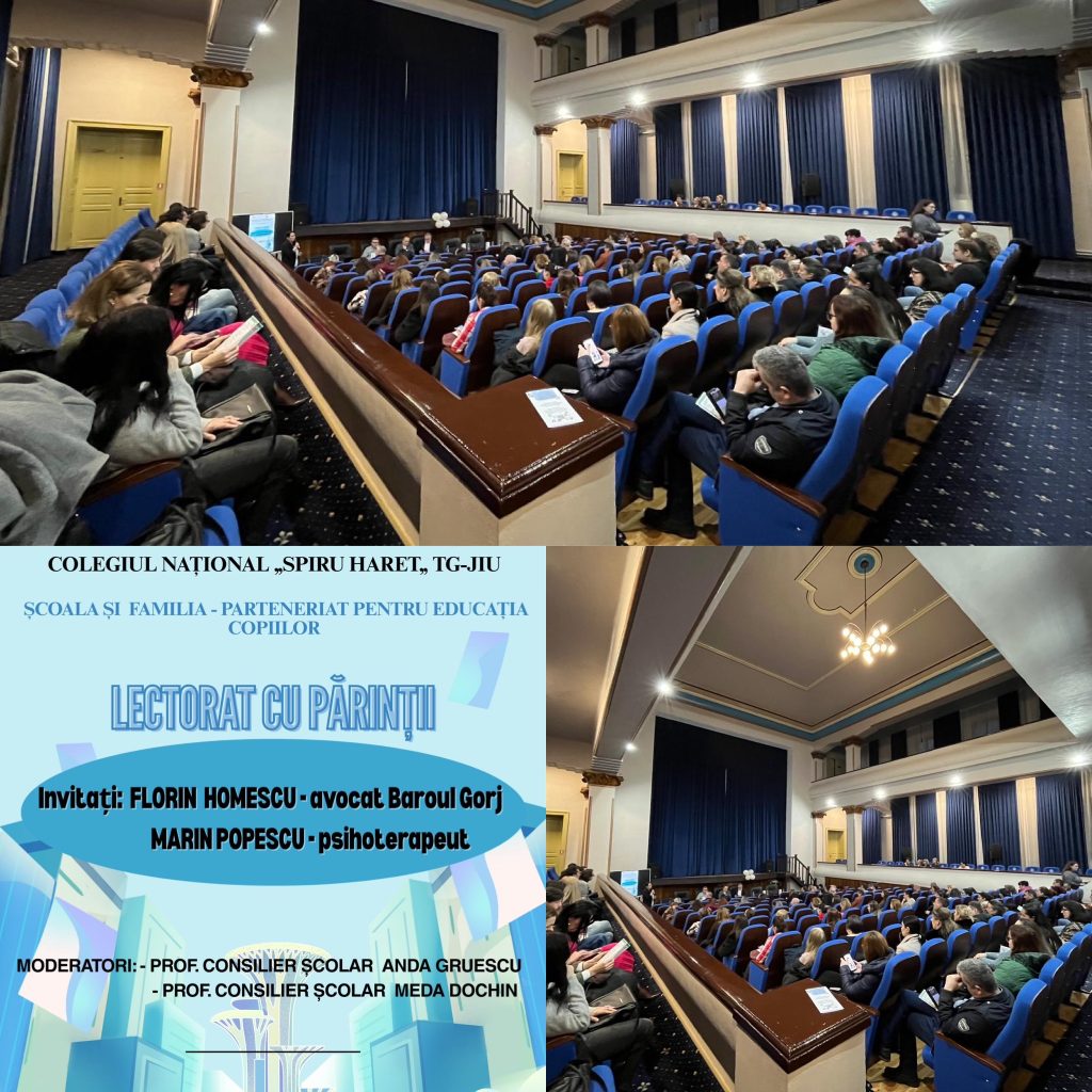 “Aseară, în amfiteatrul Colegiului Național „Spiru Haret”, a avut loc lectoratul inițiat de Liceul de Arte „Constantin Brăiloiu” din Târgu Jiu, la care au participat peste 200 de părinți. Invitații noștri, avocatul Homescu Florin și psihoterapeutul Marin Popescu, au abordat teme esențiale privind parteneriatul școală–familie.