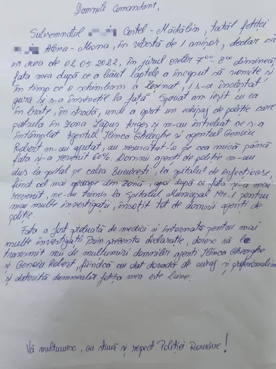 Tot pe pagina Poliției Române a fost publicată și scrisoarea tatălui micuței de un anișor.