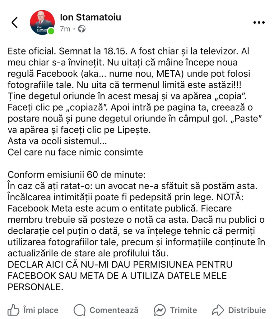 Când dezinformarea online lovește, lovește tare. Iar de data asta, nu orice utilizator Facebook a mușcat momeala, ci chiar un primar în funcție! Ion Stamatoiu, edilul comunei Scoarța din județul Gorj, a reușit să stârnească hohote de râs după ce a postat pe pagina sa oficială un mesaj fals, vechi și complet demontat de ani de zile, în care avertizează că Meta (fostul Facebook) va începe de mâine să „folosească pozele utilizatorilor fără permisiune”.