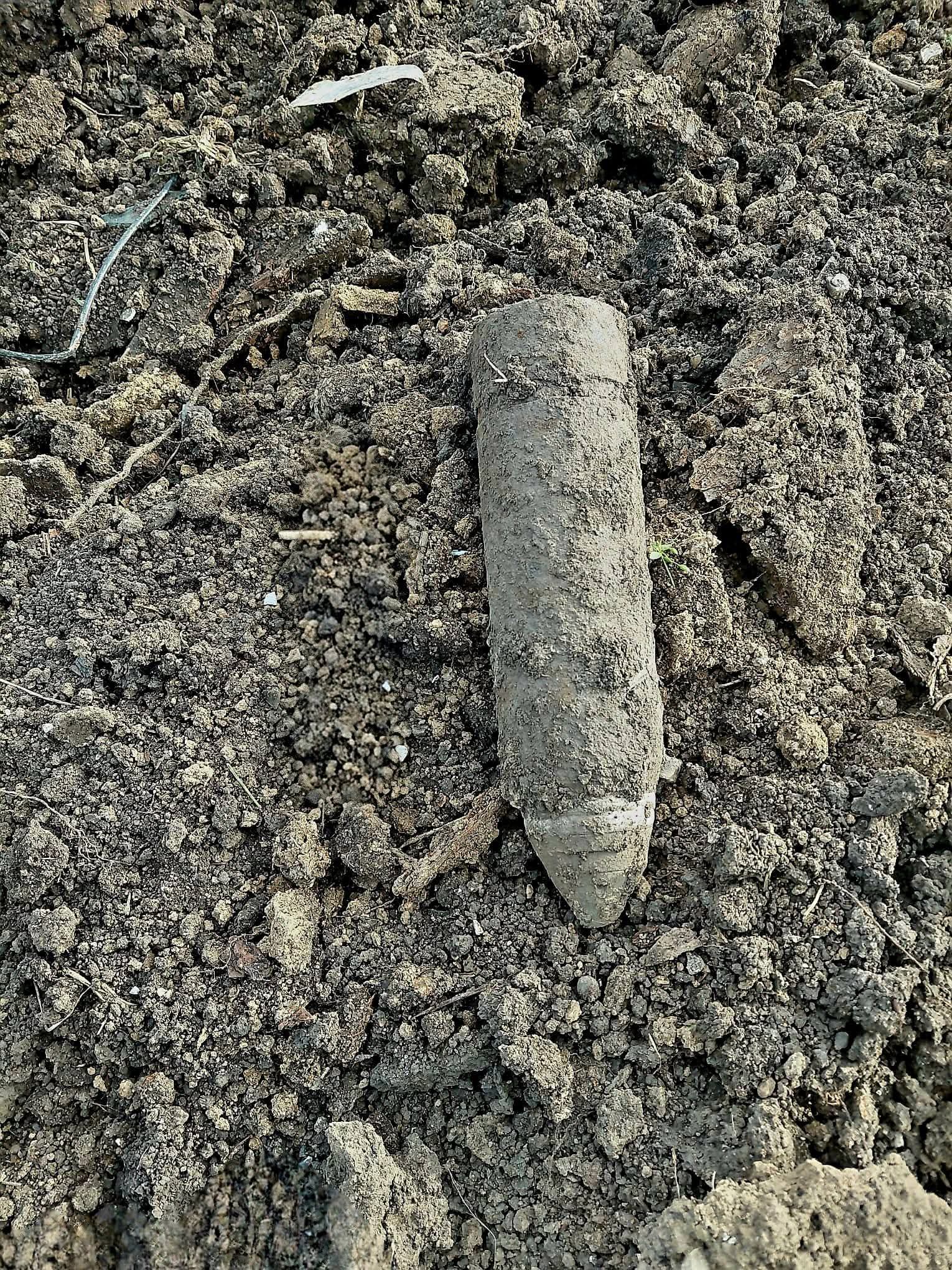 Proiectil exploziv descoperit pe un teren agricol. FOTO