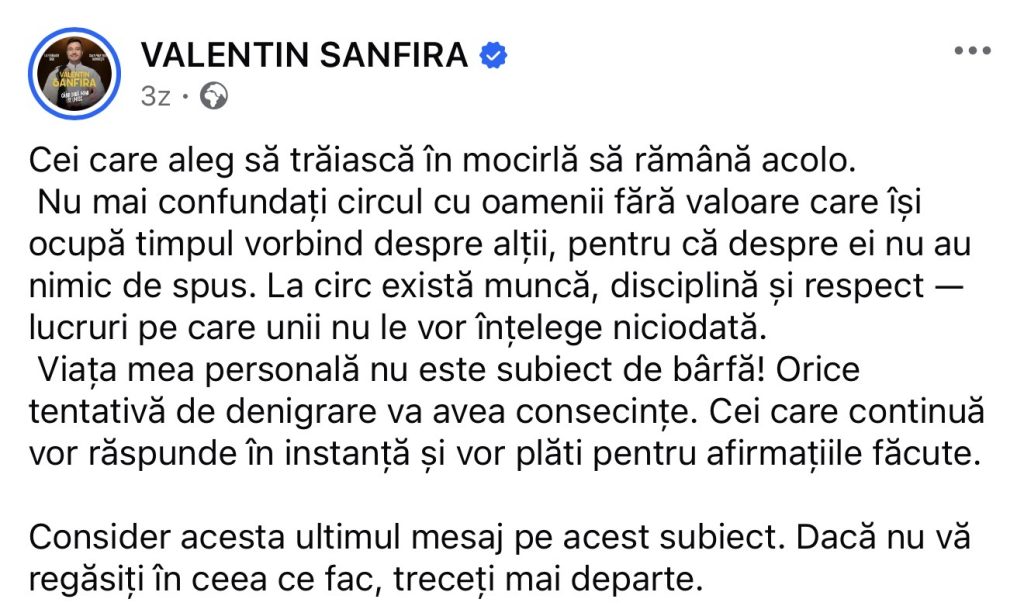 Consider acesta ultimul mesaj pe acest subiect. Dacă nu vă regăsiți în ceea ce fac, treceți mai departe”, a scris pe rețelele de Valentin Sanfira.