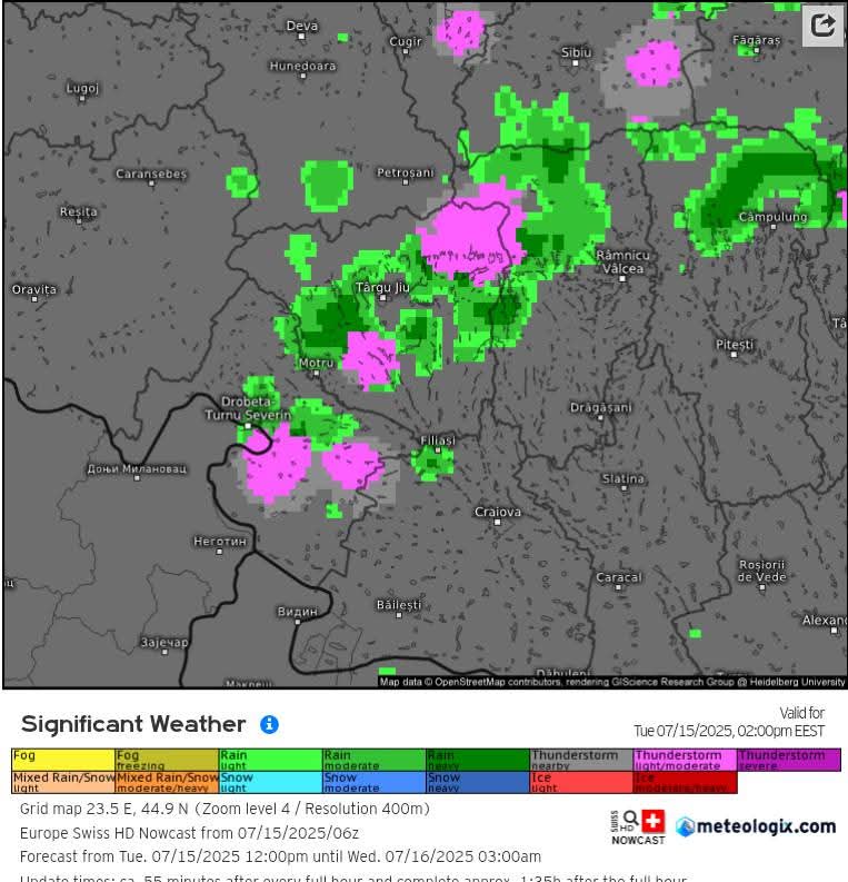 „Fenomene meteorologice vizate: Instabilitate atmosferică temporar accentuată. Interval de valabilitate: 15 iulie 2025 (între orele: 12:00 – 18:00).