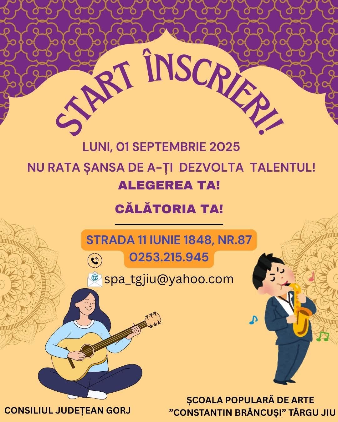 De astăzi, 1 septembrie 2025, Școala Populară de Arte „Constantin Brâncuși” din Târgu Jiu își deschide oficial porțile pentru toți cei care doresc să-și pună în valoare talentul artistic și să învețe alături de profesioniști.