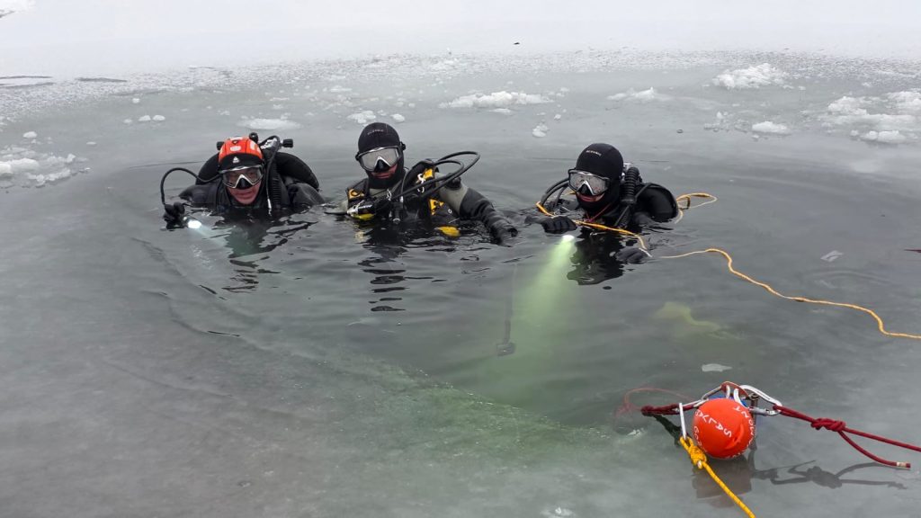 - Echipa a organizat și o acțiune de căutare subacvatică, marcând locul de ieșire de sub gheață cu dispozitive de semnalizare luminoasă.