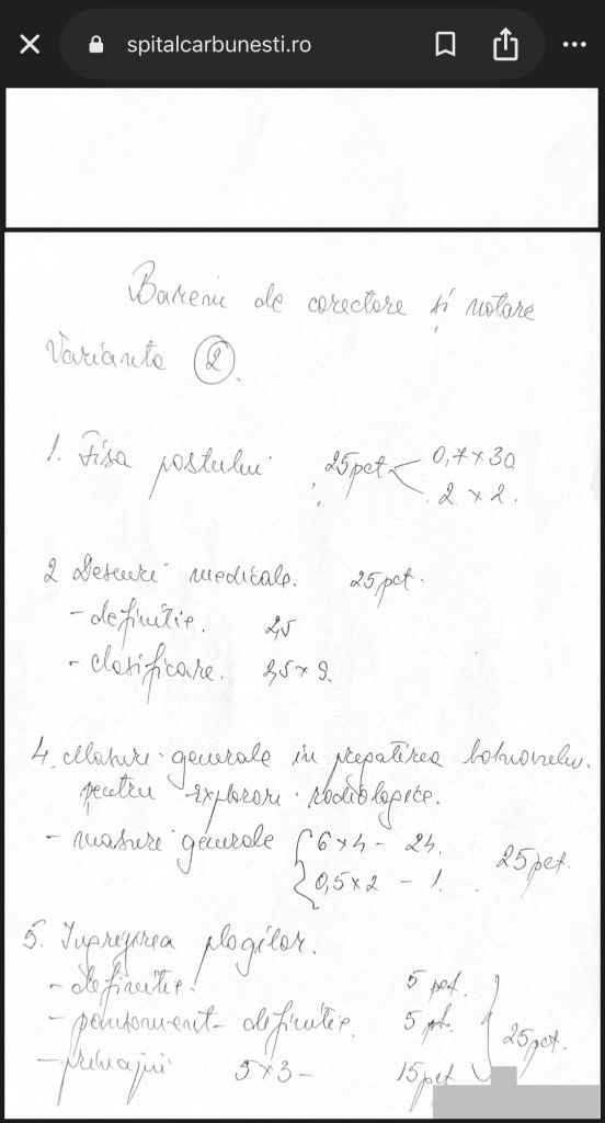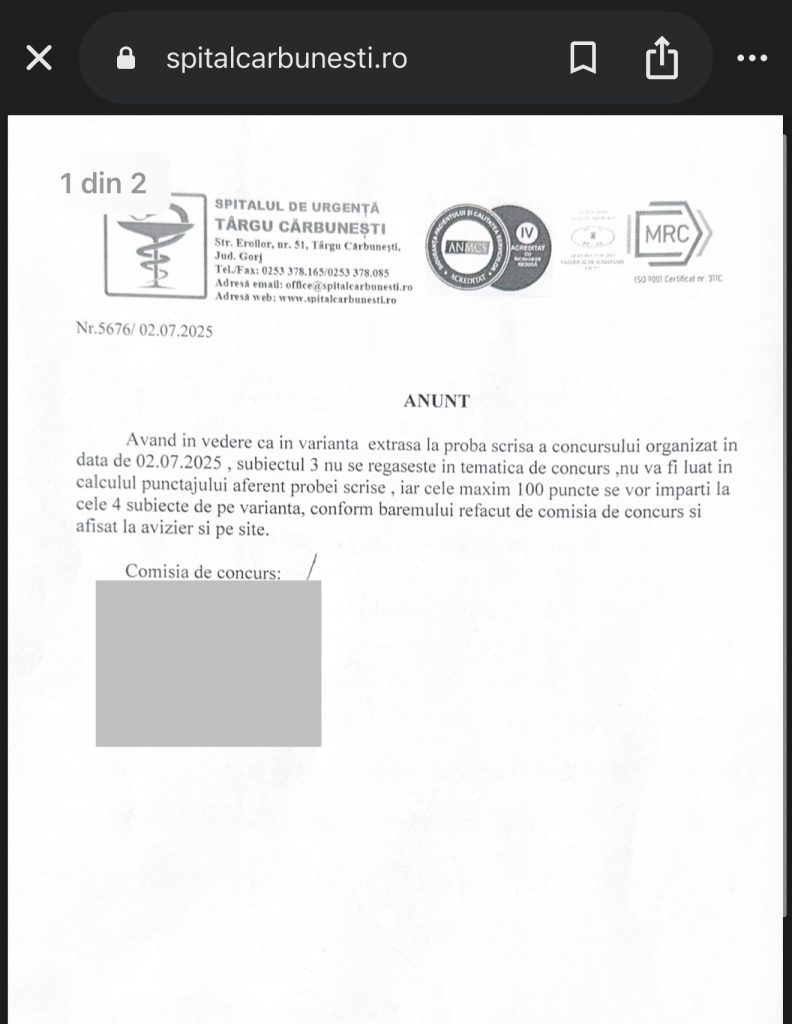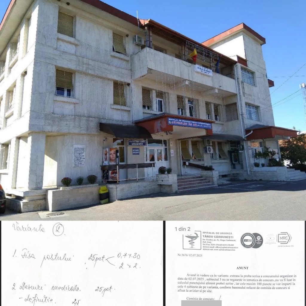 Situație tensionată la Spitalul de Urgență Târgu Cărbunești, unde astăzi, începând cu ora 9:00, a avut loc proba scrisă din cadrul concursului pentru ocuparea posturilor de asistent medical generalist debutant. Imediat după susținerea probei, candidații au fost informați, printr-un anunț publicat pe site-ul spitalului, că subiectul 3 din varianta extrasă nu va fi punctat, deoarece nu se regăsește în tematica oficială a concursului.