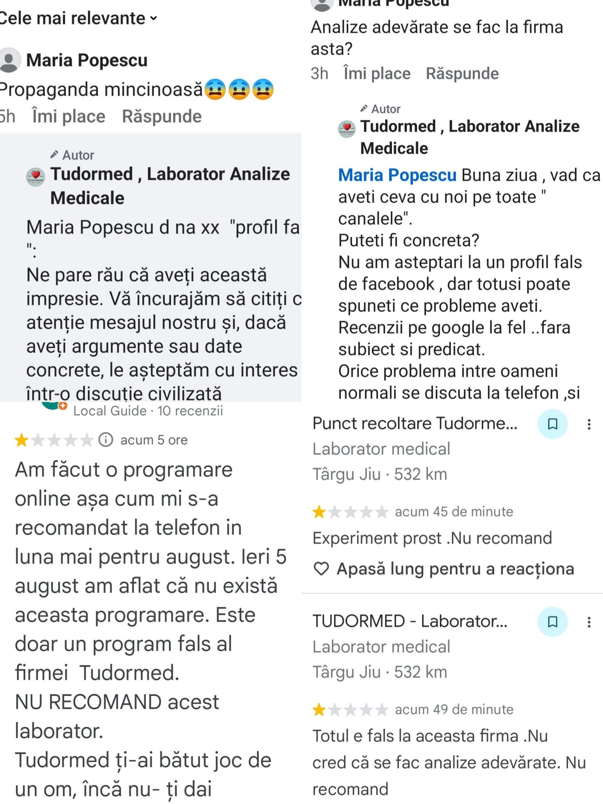 „Astăzi am observat apariția unor recenzii și comentarii care nu reflectă activitatea noastră medicală și nu provin din experiențe reale ale pacienților noștri”, au transmis reprezentanții laboratorului, subliniind că respectul față de pacient și transparența reprezintă piloni esențiali ai funcționării Tudormed.