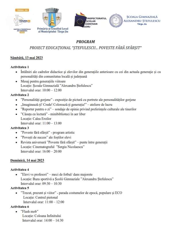 Școala Gimnazială ”Alexandru Ștefulescu”, în colaborare cu Primăria Municipiului Târgu Jiu și Inspectoratul Școlar Județean Gorj, va da startul unui proiect educațional reprezentativ pentru Capitala Tineretului – Târgu Jiu.