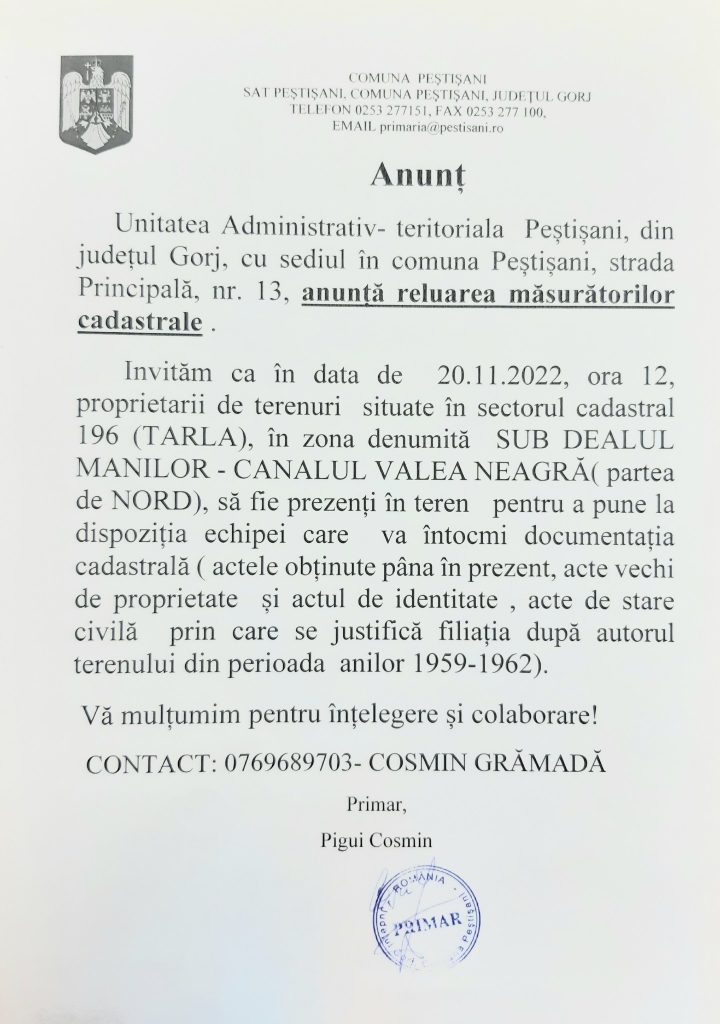 Primăria comunei Peștișani anunță reluarea măsurătorilor cadastrale. În data de 20 noiembrie, proprietarii de terenuri situate în sectorul cadastral 196 (tarla), în zona denumită ,,Sub Dealul manilor-canalul Valea Neagră (partea de Nord), sunt invitați să se prezinte în teren pentru a pune la dispoziția echipei care va întocmi documentația cadastrală (actele obținute până în prezent, acte vechi de proprietate și actul de identitate, acte de stare civilă prin care se justifică filiația după autorul terenului din perioada anilor 1959-1962).