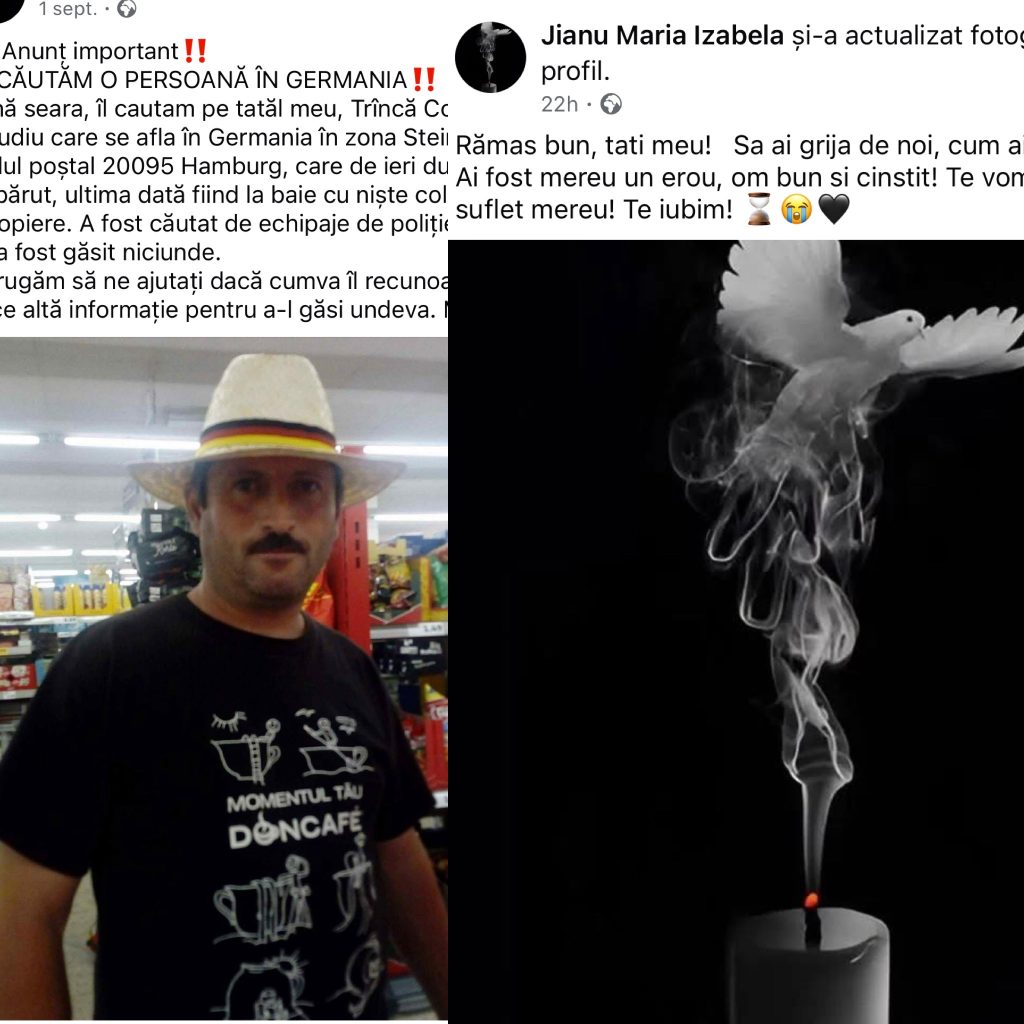 „Căutăm o persoană în Germania! Bună seara, îl căutăm pe tatăl meu, Trîncă Constantin-Claudiu, care de ieri după-masă a dispărut. A fost căutat de echipaje de poliție, scafandri, însă nu a fost găsit nicăieri. Vă rugăm să ne ajutați dacă cumva îl recunoașteți sau aveți orice informație care ar putea duce la găsirea lui. Mulțumim!” – scria atunci fiica sa, într-un mesaj care a emoționat o întreagă comunitate.