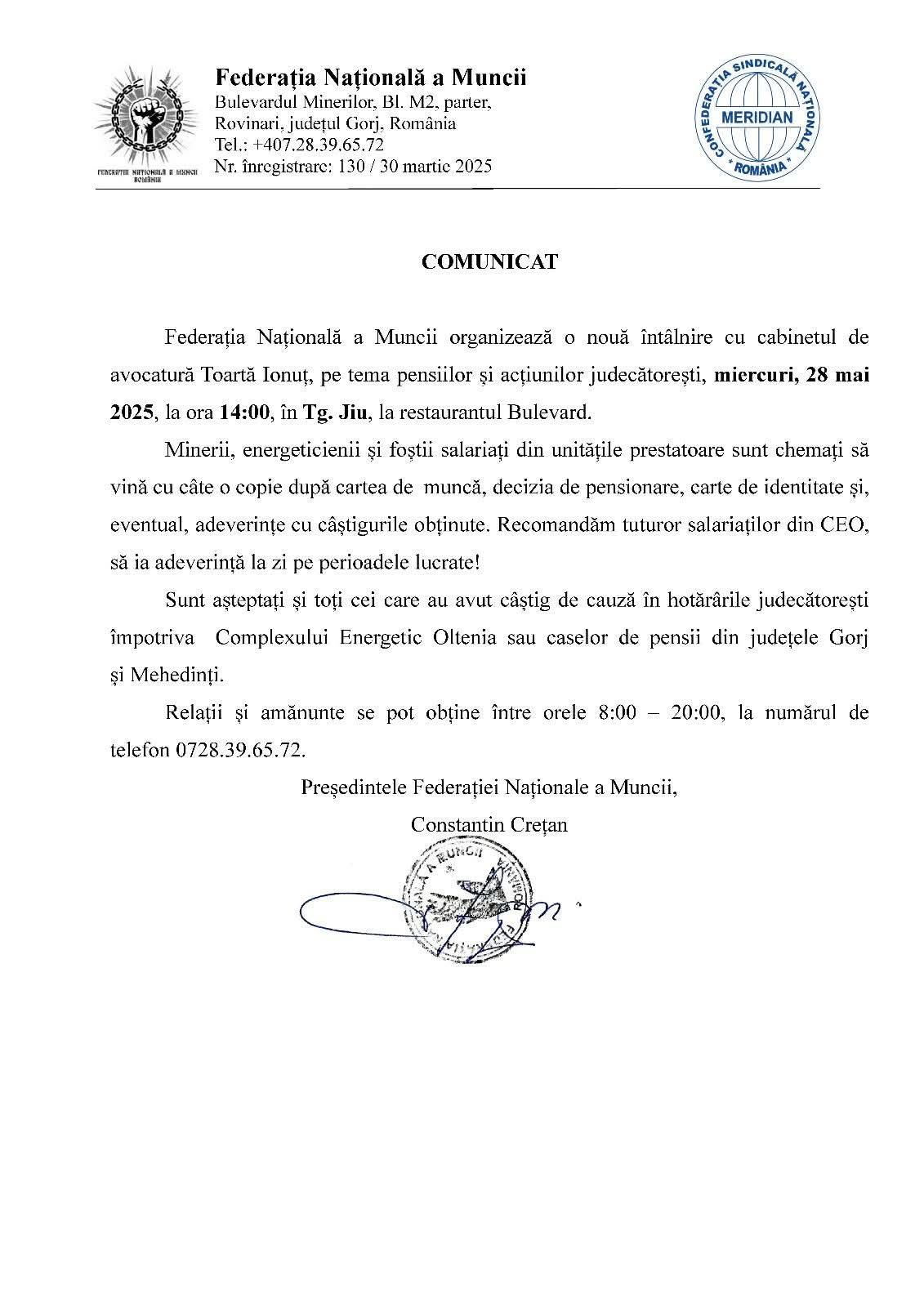 Federația Națională a Muncii anunță o nouă întâlnire de informare extrem de importantă, organizată împreună cu cabinetul de avocatură Toartă Ionuț, pe tema pensiilor și a acțiunilor în instanță câștigate de angajați.