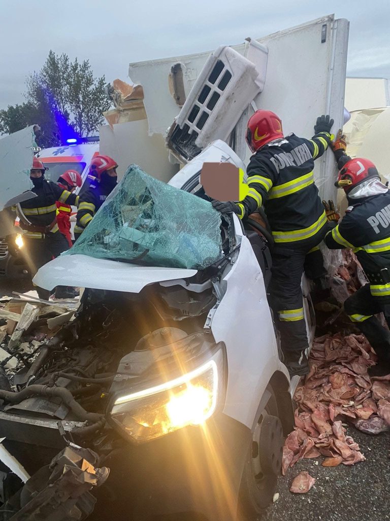 În urma accidentului, încărcătura din autotren (carne) s-a împrăștiat pe suprafața de rulare”, a transmis Centrul INFOTRAFIC al IGPR.