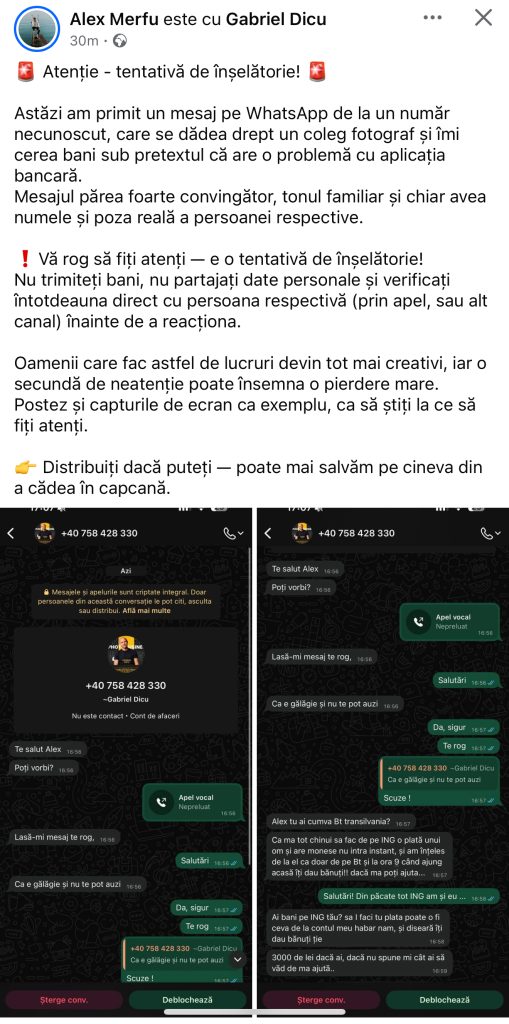 „Vă rog să fiți atenți — e o tentativă de înșelătorie! Nu trimiteți bani, nu partajați date personale și verificați întotdeauna cu persoana respectivă înainte să reacționați. Oamenii care fac astfel de lucruri devin tot mai creativi.”