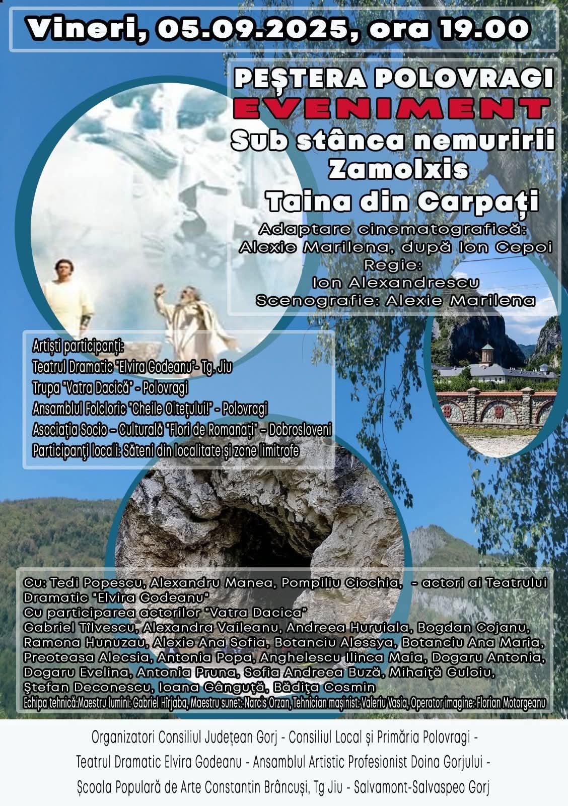 Începând cu ora 19.00, în Peștera Polovragi va fi pus în scenă spectacolul de teatru „Sub stânca nemuririi – Zamolxis: Taina din Carpați”, o reprezentație ce readuce la viață miturile și valorile dacice, într-o atmosferă încărcată de mister și emoție.