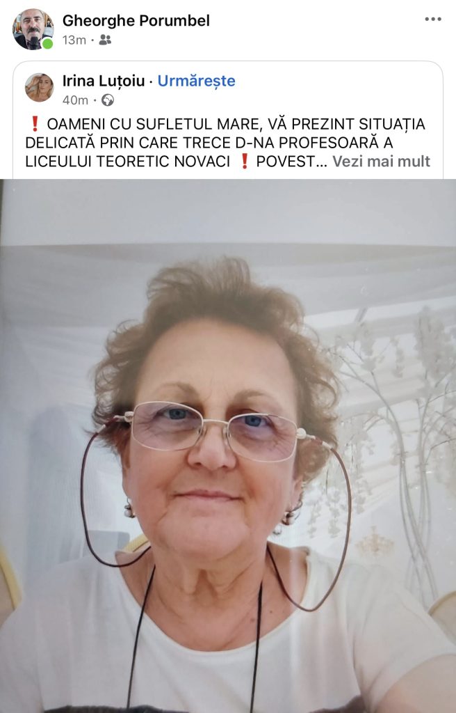 Apelul emoționant a fost făcut public de o apropiată a sa, Irina Luțoiu, care speră ca vestea să ajungă cât mai departe și să sensibilizeze sufletele mari ale gorjenilor și nu numai.