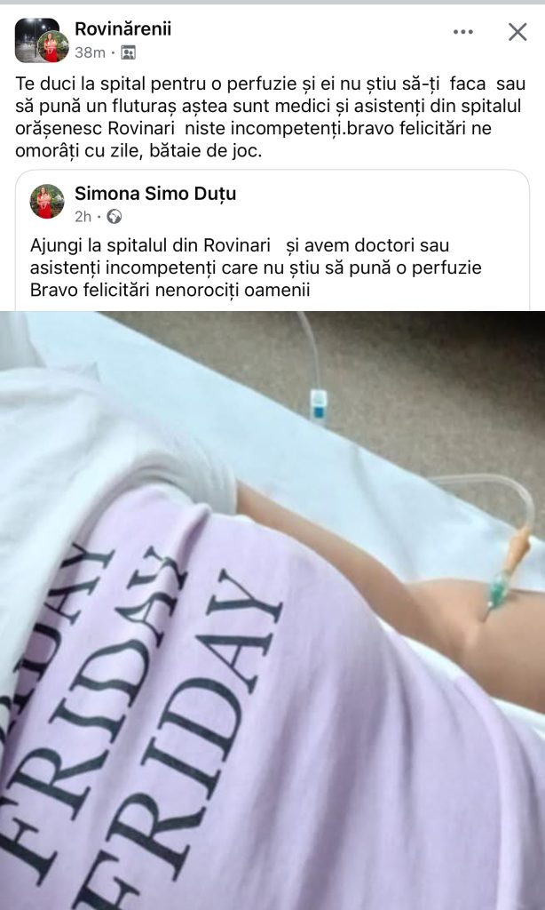 „Ajungi la spital și avem asistenți incompetenți care nu știu să pună o perfuzie. Bravo, felicitări, nenorociți oamenii”, scrie pacienta, însoțind mesajul de o fotografie în care se vede brațul ei cu o branulă montată.