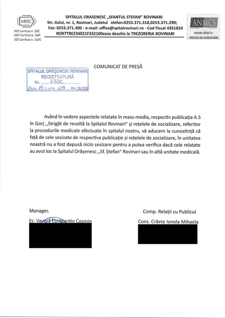 Un nou scandal lovește sistemul medical din Gorj, după ce o tânără a postat pe rețelele de socializare o imagine și un mesaj dur la adresa personalului medical din cadrul Spitalului Orășenesc Rovinari.