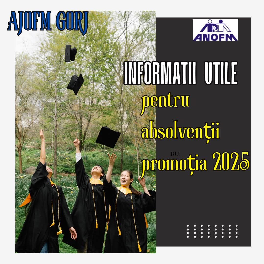 AJOFM Gorj informează absolvenții promoția 2025 de faptul că data absolvirii pentru anul şcolar 2024-2025 este 06.06.2025, iar în termen de 60 de zile de la absolvire aceștia sunt aşteptaţi să se înregistreze în evidenţa AJOFM Gorj pentru a beneficia de servicii personalizate în vederea integrării pe piaţa forţei de muncă.