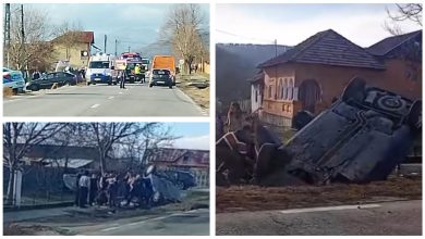 Accident pe DN 67! O mașină s-a răsturnat pe plafon și alta a ajuns în șanț. FOTO