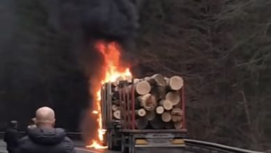 Autocamion cu lemne cuprins de flăcări pe DN 15