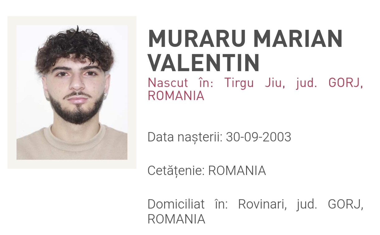 Un tânăr de 22 de ani din Rovinari, Marian Valentin Muraru, este căutat de Poliția Română după ce nu a fost găsit la domiciliu, în urma emiterii unui mandat de arestare preventivă.