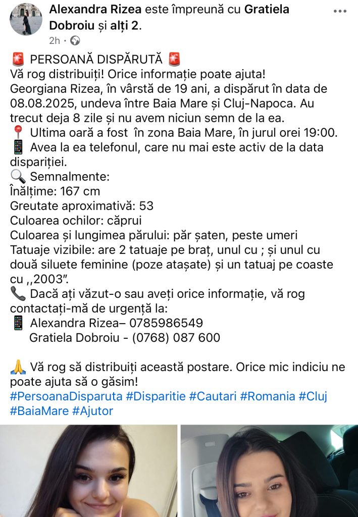 O tânără de 19 ani, Georgiana Rizea, originară din județul Vâlcea și stabilită la Baia Mare, a dispărut fără urmă pe data de 8 august 2025. Ultima dată a fost văzută în zona municipiului Baia Mare, în jurul orei 19:00.