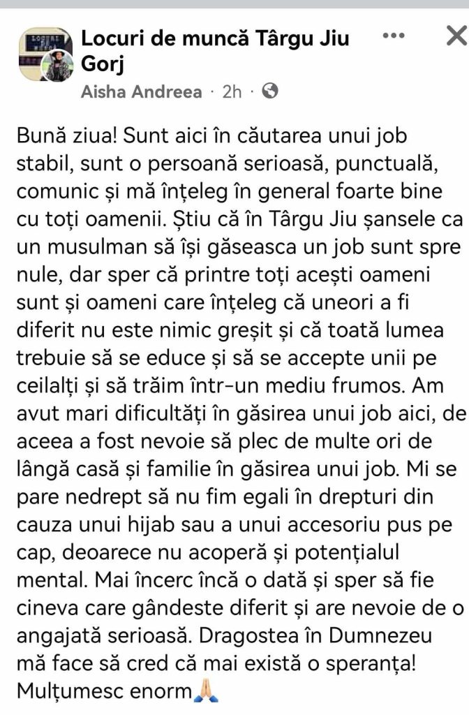 ”Bună ziua! Sunt aici în căutarea unui job stabil, sunt o persoană serioasă, punctuală, comunic și mă înțeleg în general foarte bine cu toți oamenii. Știu că în Târgu Jiu șansele ca un musulman să își găsească un job sunt spre nule, dar sper că printre toți acești oameni sunt și oameni care înțeleg că uneori a fi diferit nu este nimic greșit și că toată lumea trebuie să se educe și să se accepte unii pe ceilalți și să trăim într-un mediu frumos. Am avut mari dificultăți în găsirea unui job aici, de aceea a fost nevoie să plec de multe ori de lângă casă și familie în găsirea unui job. Mi se pare nedrept să nu fim egali în drepturi din cauza unui hijab sau a unui accesoriu pus pe cap, deoarece nu acoperă și potențialul mental. Mai încerc încă o dată și sper să fie cineva care gândește diferit și are nevoie de o angajată serioasă. Dragostea în Dumnezeu mă face să cred că mai există o speranță!”, a scris Andreea.