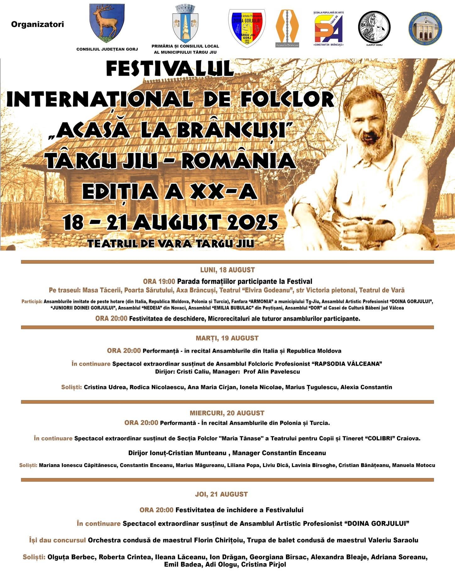 Târgu Jiu se pregătește să găzduiască, între 18 și 21 august, o nouă ediție a Festivalului Internațional de Folclor „Acasă la Brâncuși”, un eveniment ce aduce în prim-plan tradițiile și dansurile populare din țară și din străinătate.