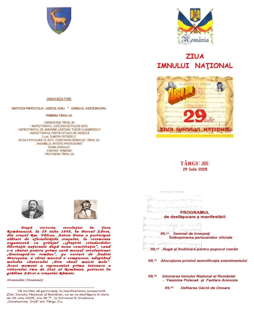 Pe 29 iulie 2025, autoritățile locale și județene din Gorj organizează, la Târgu Jiu, o serie de manifestări dedicate Zilei Imnului Național al României, eveniment care se va desfășura la intrarea în Stadionul „Constantina Diță”.