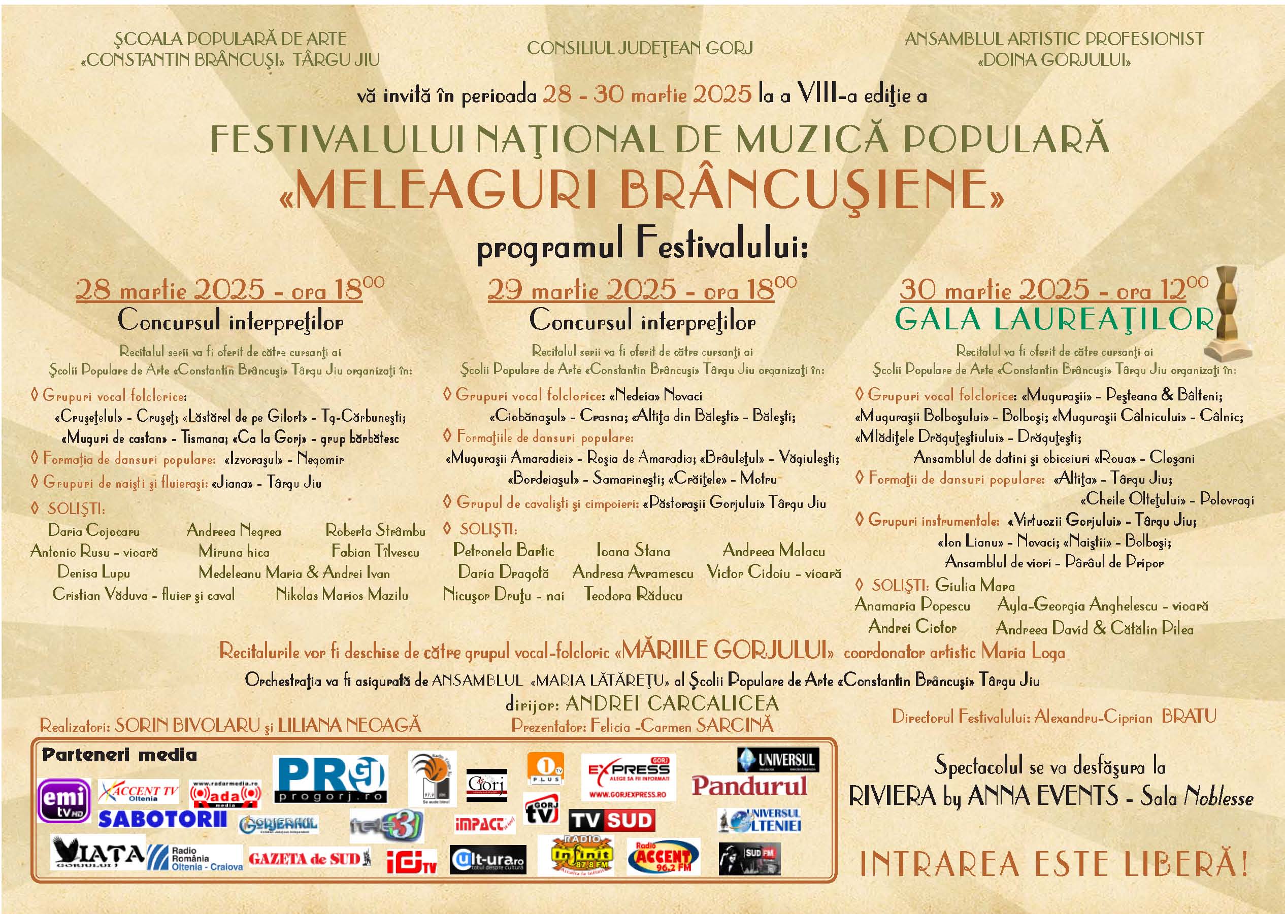 Acompaniamentul orchestral va fi asigurat de Ansamblul Folcloric “Maria Lătărețu” al Școlii Populare de Arte ”Constantin Brâncuși” Târgu Jiu, dirijor Andrei Carcalicea.