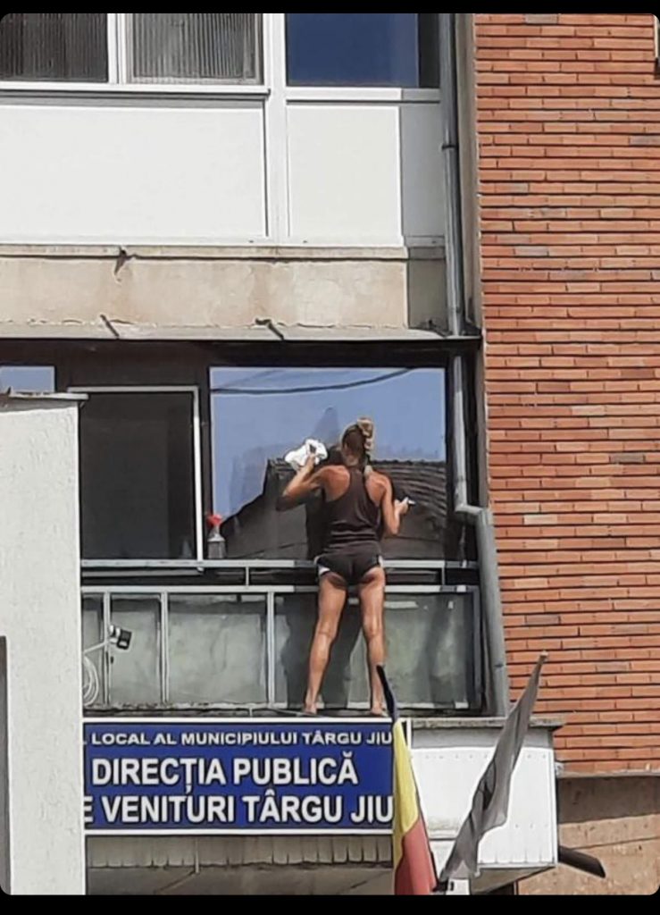 Pe adresa redacției am primit o imagine realizată chiar deasupra sediului Direcției Publice de Venituri Târgu Jiu din zona gării. În imagine apare o domnișoară cocoțată pe acoperișul Direcției de Venituri îmbrăcată într-o ținută extrem de mulată care îi lăsa la vedere o bună parte din posterior. Și dacă într-o mână avea cârpa cu care ștergea geamul în cealaltă, tânăra își ținea tacticos țigara putând oricând să se dezechilibreze și să cadă.