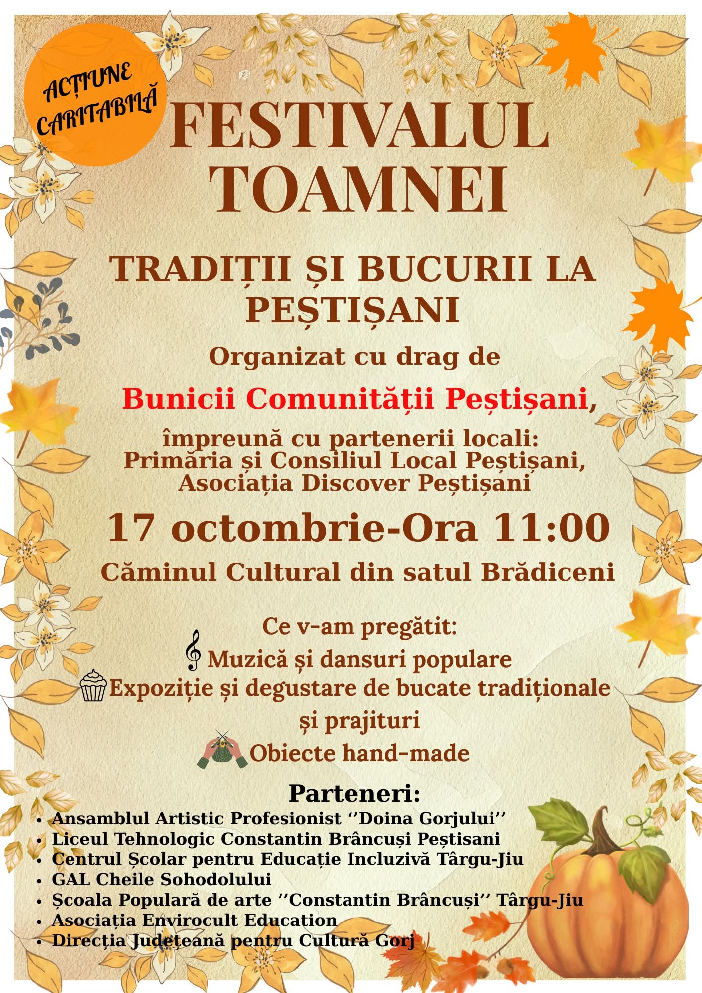 Toamna se sărbătorește la Peștișani! Festivalul Tradițiilor și Bucuriilor va avea loc vineri