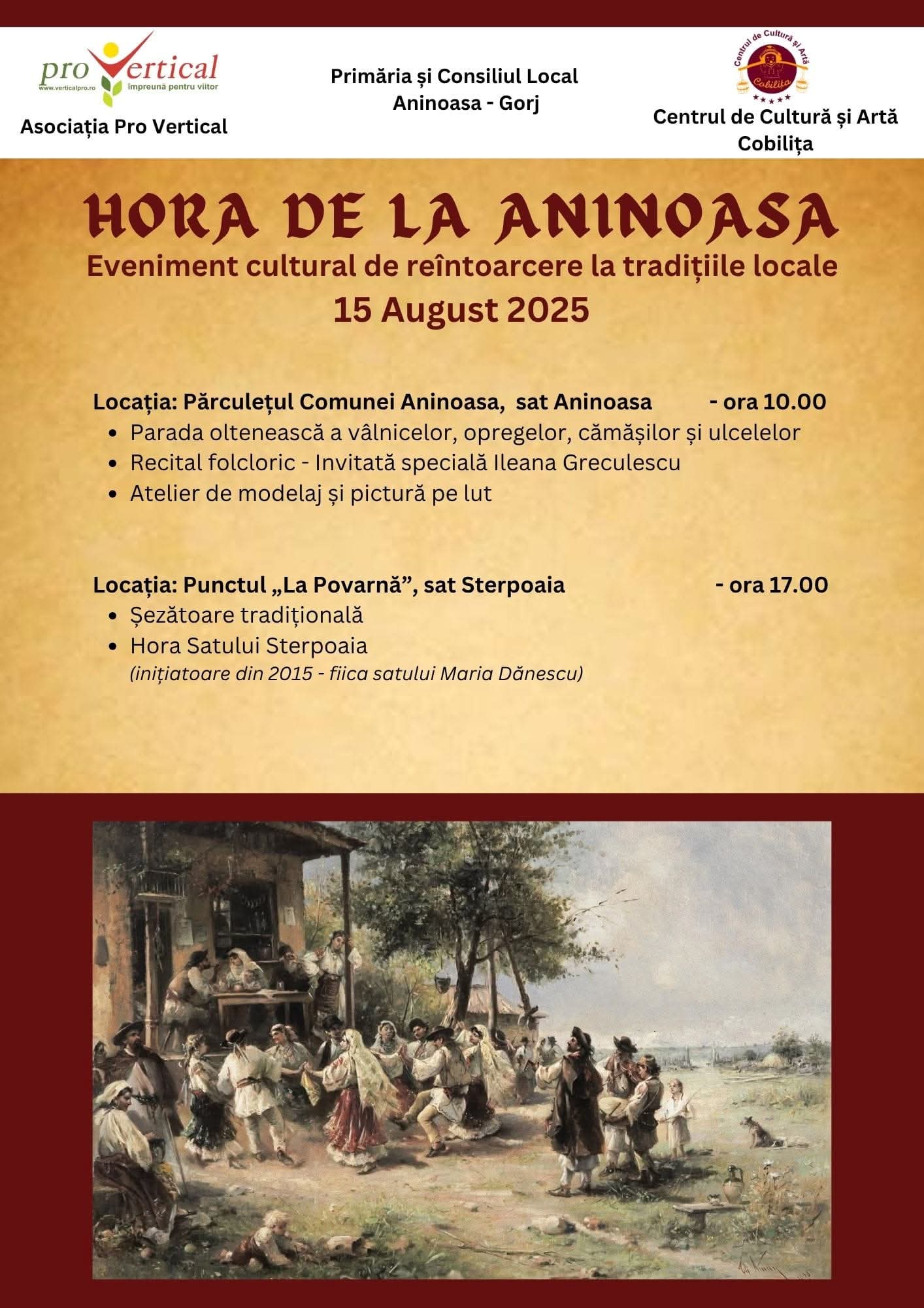 Pe 15 august 2025, comuna Aninoasa din județul Gorj îmbracă haine de sărbătoare și vă invită la un eveniment de suflet: „Hora de la Aninoasa – Eveniment cultural de reîntoarcere la tradițiile locale”, organizat cu sprijinul Primăriei și Consiliului Local Aninoasa, Asociației Pro Vertical și Centrului de Cultură și Artă Cobilița.