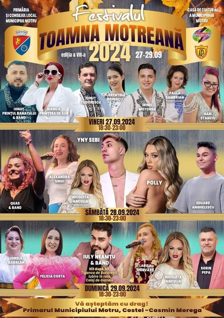 Vineri 27 septembrie în Motru va debuta sărbătoarea „Festivalul Toamnei Motrene 2024” și care se va încheia dduminică, 29 septembrie.