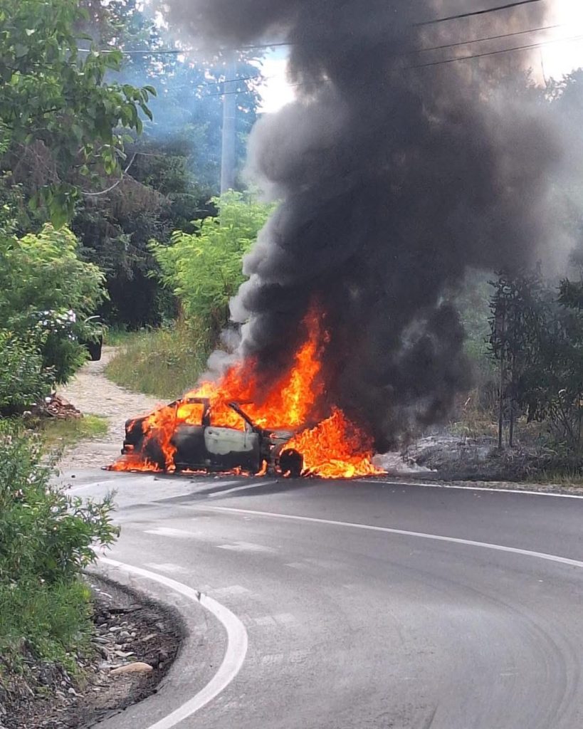 O mașină a luat foc în mers în comuna Ciofrângeni, satul Burluși.