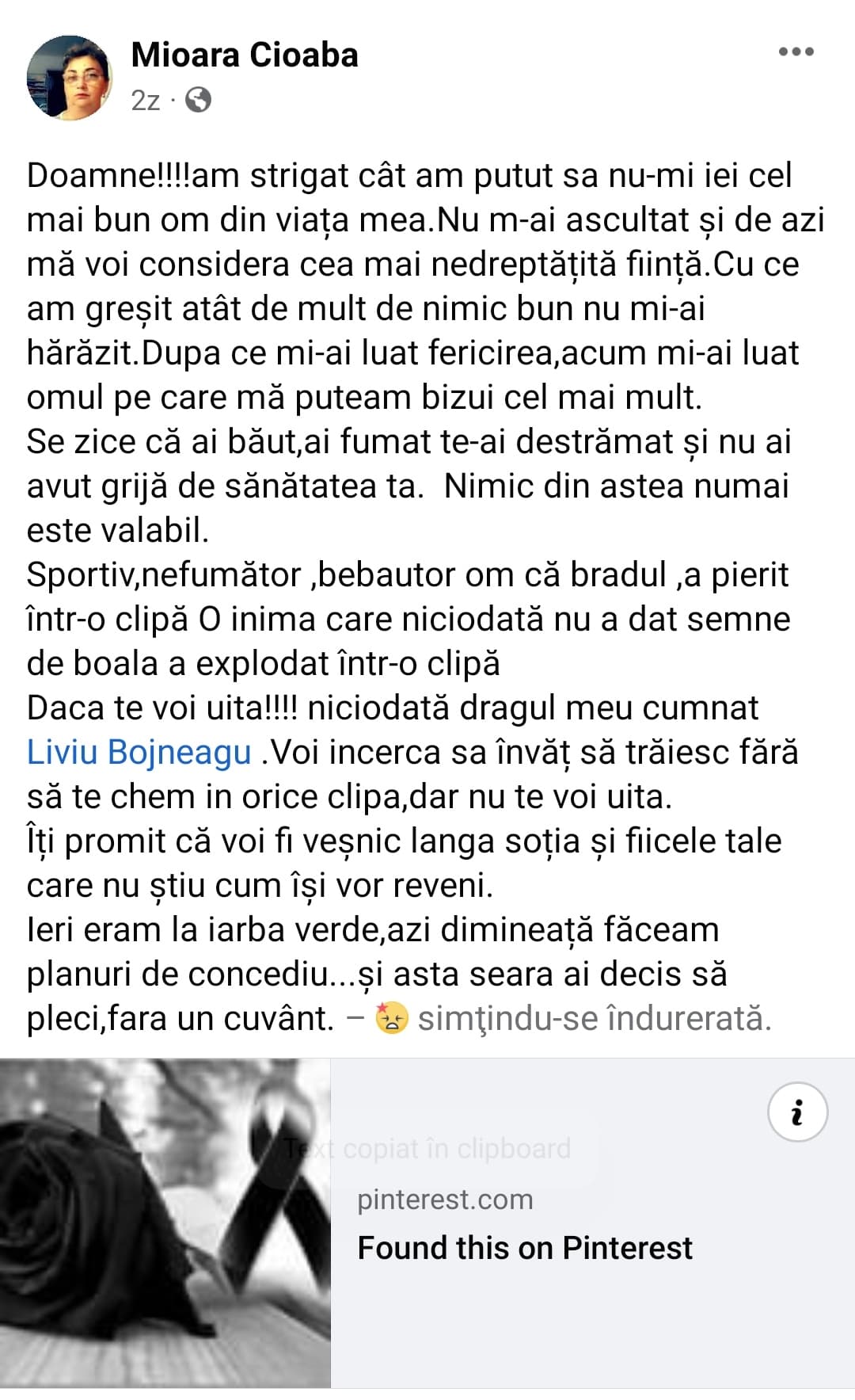 Liviu Bojneagu a muncit până recent la Cariera Roșiuța. Acesta lucrase la Secția Mecanică a unității miniere ca lăcătuș ungător. Nu a apucat însă să se bucure de pensie, iar foștii colegi de muncă sunt șocați, omul nefiind bolnav, dimpotrivă, îl știau toți ca un bărbat în putere. A făcut însă infarct, din senin, iar familia a fost devastată. Sute de mesaje de condoleanțe au curs pe rețelele de socializare. Două fete adolescente au rămas fără tată. „Doamne!!!!am strigat cât am putut, să nu-mi iei cel mai bun om din viața mea. Nu m-ai ascultat și de azi mă voi considera cea mai nedreptățită ființă. Cu ce am greșit atât de mult de nimic bun nu mi-ai hărăzit. După ce mi-ai luat fericirea, acum mi-ai luat omul pe care mă puteam bizui cel mai mult. Se zice că ai băut, ai fumat te-ai destrămat și nu ai avut grijă de sănătatea ta. Nimic din astea numai este valabil. Sportiv, nefumător, nebăutor, om că bradul a pierit într-o clipă. O inima care niciodată nu a dat semne de boala a explodat într-o clipă Daca te voi uita!!!! niciodată dragul meu cumnat Liviu Bojneagu. Voi încerca să învăț să trăiesc fără să te chem în orice clipă, dar nu te voi uita. Îți promit că voi fi veșnic lângă soția și fiicele tale care nu știu cum își vor reveni. Ieri eram la iarba verde, azi dimineață făceam planuri de concediu…și asta seara ai decis să pleci, fără un cuvânt”, a scris cumnata fostului salariat CEO pe pagina sa de Facebook.