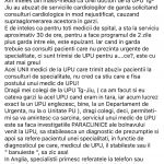 „Tot nu-mi văd de treabă şi mă amestec unde chiar nu-mi mai fierbe oala de mult timp: cum lucrează, unii doctori, la UPU Tg-Jiu, aşa încât i-au determinat pe cardiogi să nu mai vrea să facă gărzi !! ( Nu mai ştiu ce s-a întâmplat după data la care majoritatea cardiologilor au cerut să li se schimbe contractul de muncă în…” fără gărzi”. Sper că au revenit la acea decizie, spre binele pacienţilor cardiaci veniţi la urgenţă!). Am înţeles din mass-media ca UNII doctori de la UPU Tg-Jiu au abuzat de serviciile cardiologilor de gardă solicitând consulturi cardiologice în mod nejustificat, cauzând supraaglomerarea acestora în gărzi. E de înţeles că pentru toţi medicii de spital, a sta la serviciu aproximativ 30 de ore, pentru a face programul de 2 zile plus gardă între ele, este epuizant. Iar când în gardă trebuie să consulţi pacienţi care nu prezintă urgenţe de specialitate, ci sunt trimişi de UPU pentru a….ce?, este cu atât mai greu! Acei UNII medici de la UPU care trimit abuziv pacienţii la consulturi de specialitate, nu cred că ştiu care e fişa postului unui medic de UPU! Dragii mei colegi de la UPU Tg-Jiu, ( că am făcut şi eu câteva gărzi la acel UPU când eram în ţară, iar acum lucrez exact la un UPU englezesc, bine, la un Departament de Urgenţă, nu la o Unitate PU ), dragi colegi, deci, permiteţi-mi să vă amintesc că sarcina, serviciul unui medic de UPU este să facă investigaţiile PARACLINICE ale bolnavului venit la UPU, să stabilească un diagnostic de prezumpţie şi apoi să refere pacientul unei specialităţi, în funcţie de diagnosticul pe care, medicul de UPU, îl stabileşte sau îl ” bănuieşte „, să zic aşa! În Anglia, specialiştii primesc referatele la telefon sau online, şi acceptă sau nu să vadă pacientul doar dacă medicul de urgenţă ( UPU ) a făcut toate investigaţiile paraclinice, ( care exclud consulturile de specialitate), iar rezultatele acelor investigaţii conduc spre diagnosticul pentru care bolnavul este prezentat specialistului. A trimite un bolnav la consulturi de specialitate doar pentru a exclude diverse posibile condiţii, pe bajbiite, asta nu e medicină, e ghicitoare, e..dat în cărţi, e orice, numai medicină nu e!!! Mă întreb cum conducerea Spitalului de Urgenţă Tg-Jiu nu a sesizat aceste aspecte??? Sau dânşii…economişti, jurişti, ingineri, etc…ce să ştie de cum trebuie să fie activitatea medicală, că n-au nici în clin nici în mânecă cu asta!! De asta ziceam, la un spital, conducerea trebuie să fie asigurată de medici, care au gândire medicală, nicidecum de alte profesii…politice! Şi mai e o problemă ce se perpetuează de ani şi ani de zile, pornită de la opoziţia chirurgilor să lucreze la Spitalul 700, când s-a dat în folosinţă Spitalul de pe Tudor ( eram acolo, lucrăm în Chirurgie, aşa că ştiu!): urgenţă trebuie făcută acolo unde ai toate specialităţile, sau cel puţin pe cele principale! Nu le enumăr, că cei avizaţi le ştiu! Bolnavii nu trebuie plimbaţi de la un spital la altul doar pentru că nimeni din cei care trebuie nu îşi pun problema lor, a bolnavilor! Şi revenind la hotărârea cardiologilor de a nu mai face gărzi, sper să se fi găsit o soluţie ca bolnavii să nu fie prejudiciaţi de un consult atât de important cum e cel cardiologic, pentru cei cu urgenţe de cardiologie! Cer scuze pentru tonul critic al postarii mele, dar e revoltător ce se întâmplă acolo!! Sănătate tuturor” a scris pe contul personal de socializare medicul Roxana Hotoboc