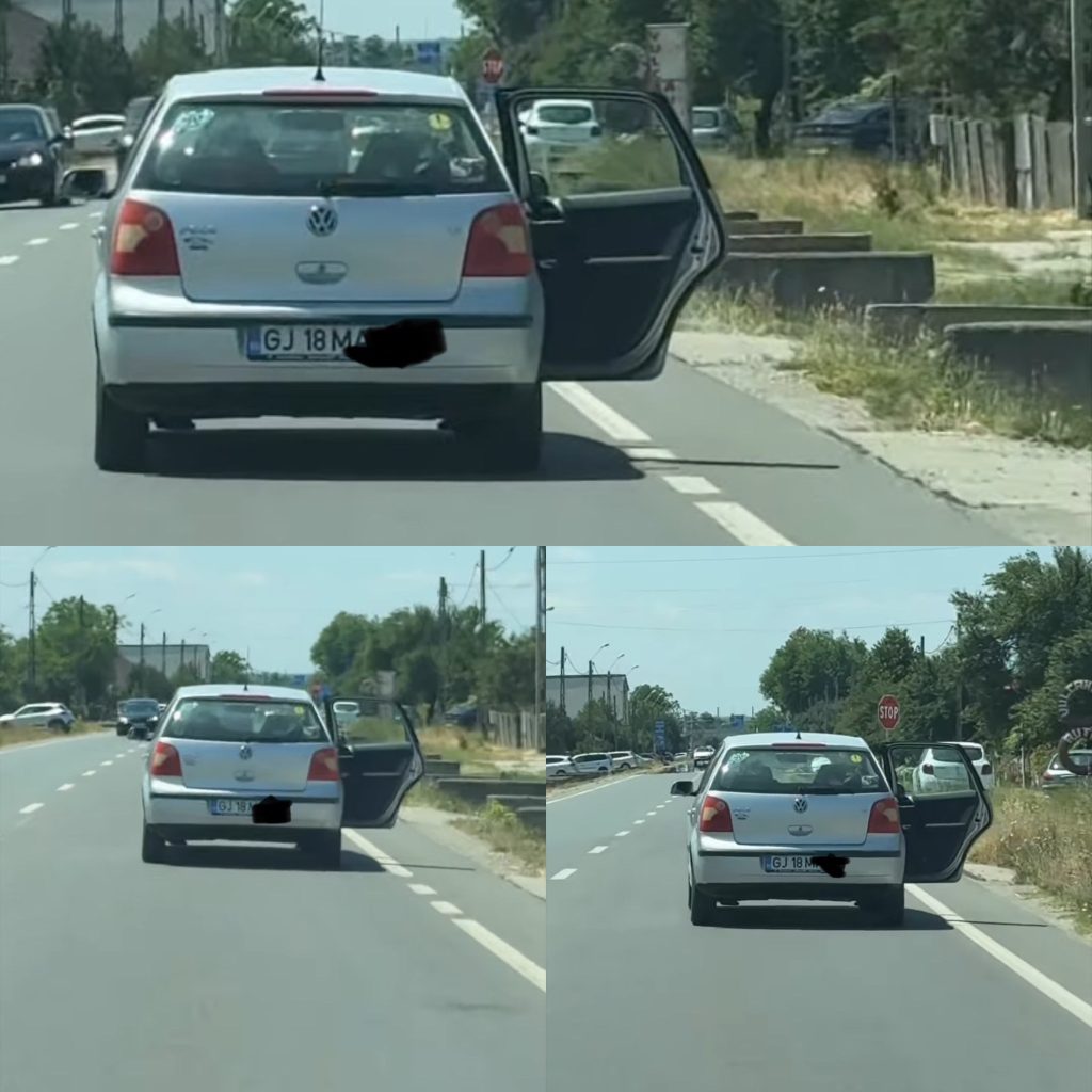 Mașina, un Volkswagen cu numere de Gorj, se deplasa aparent fără ca șoferul să fie conștient de pericolul pe care îl reprezintă o ușă deschisă în mers. Imaginile au stârnit revoltă și reacții dure din partea internauților.
