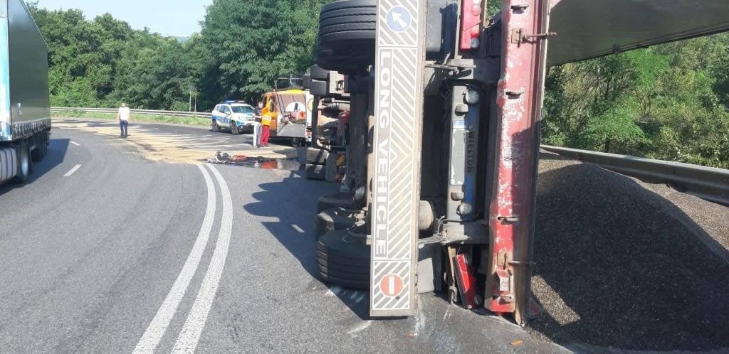 Accident rutier în această dimineață pe DN6, între localitățile Domașnea și Teregova. Traficul a fost îngreunat, după ce un șofer s-a răsturnat cu tirul care transporta semințe de floarea soarelui.