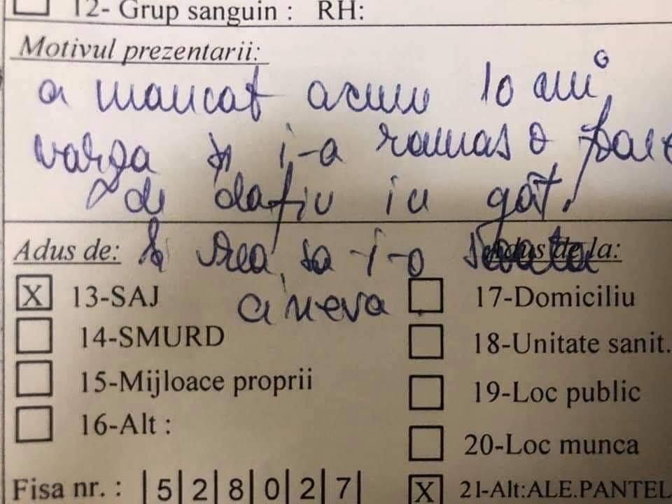 ”A mâncat acum zece ani varza și i-a rămas o foaie de dafin în gât”. Este unul dintre motivele neobișnuite pe care un pacient le-a invocat in clipa in care s-a prezentat la camera de garda a unuia dintre cele mai mari spitale din Capitala.