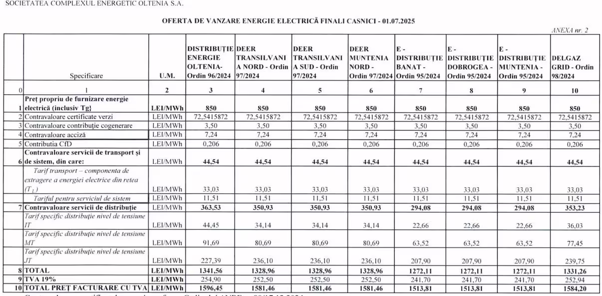 Potrivit datelor publicate pe comparatorul de oferte ANRE, CEO propune un preț al energiei active de 0,85 lei/kWh, la care se adaugă tarifele de rețea și taxele aferente. Astfel, prețul final ajunge la 1,51 lei/kWh pentru un consumator casnic.