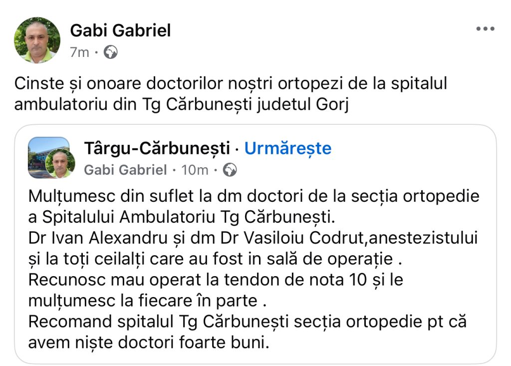 „Mulțumesc din suflet domnilor doctori de la secția Ortopedie a Spitalului Ambulatoriu Tg. Cărbunești: Dr. Ivan Alexandru și Dr. Vasiloiu Codruț, anestezistului și tuturor celor care au fost în sala de operație. Recunosc, m-au operat la tendon de nota 10 și le mulțumesc fiecăruia în parte!”