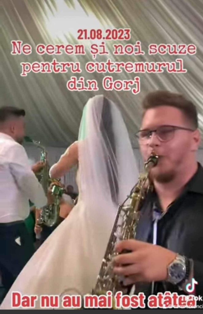 „Ne cerem și noi scuze pentru cutremurul din Gorj dar nu au mai fost atâtea saxofoane până acum aici! Așa a fost atmosfera în timp ce era cutremur”, au transmis artiștii prezenți la evenimentul de duminică din Gorj. Judetul nostru a fost zguduit însă de un seism de 4,6 pe scara Richter, dar nu s-au înregistrat nici măcar pagube materiale. In seara respectiva, nu doar mirii din filmuleț cu si un primar din Gorj a fost surprins la o petrecere de nunta. Dar distracția a mers înainte fără ca cineva să se mai sperie. De altfel, în Gorj au avut loc din martie pănă în prezent mii de cutremure de mici dimensiuni și două puternice.