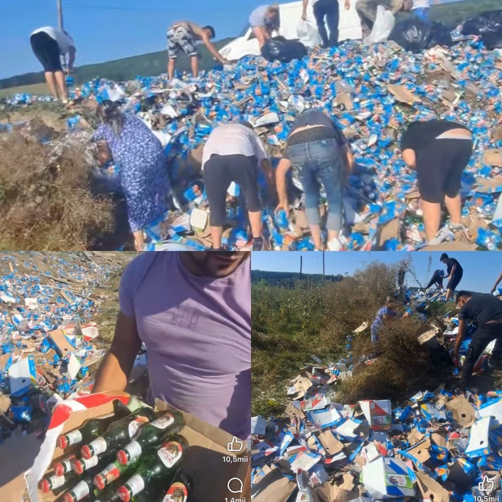 Imaginile surprinse la fața locului arată cum oamenii s-au adunat pe marginea drumului, scotocind printre baxurile sparte și adunând cât mai multe doze. În doar câteva minute, zona s-a transformat într-un fel de „festival” improvizat, cu localnici grăbiți să profite de situație.